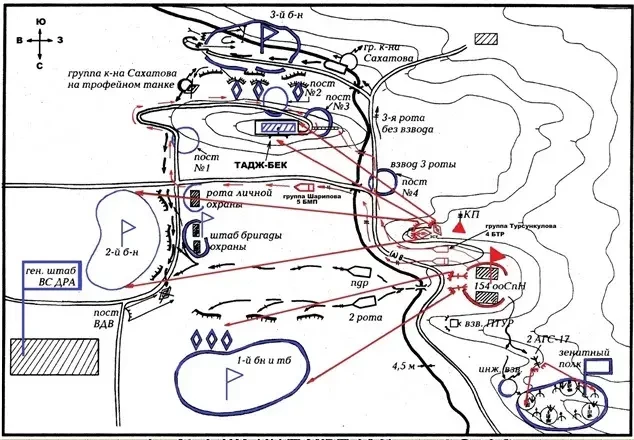 Одновременно с ними заработали АГС-17 «Пламя» — два гранатомета обстреливали позиции 1-го батальона охраны и танкового батальона, остальные два — позиции зенитного полка (см. схему).