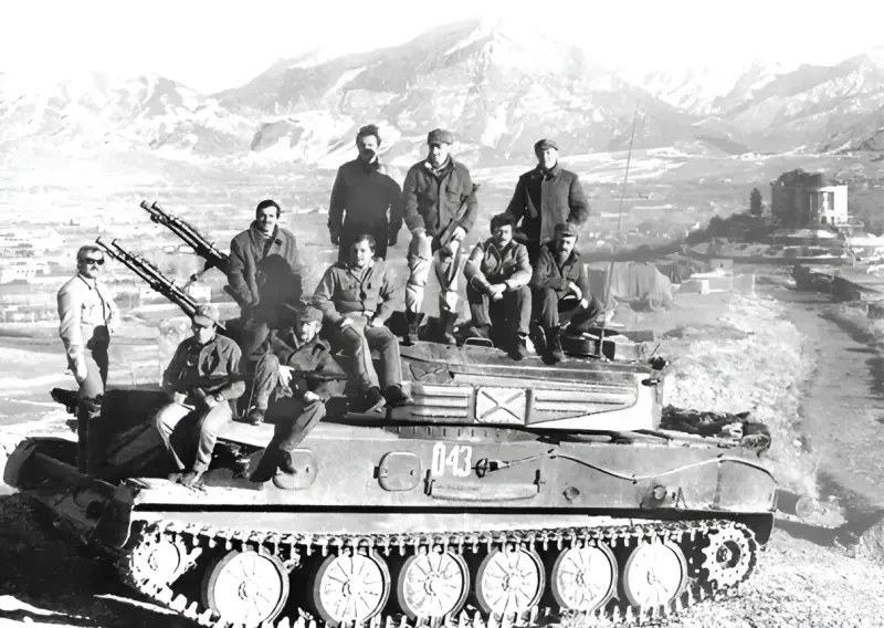 Участники штурма на ЗСУ 23-4 «Шилка» (В.М. Праута 5-й слева сидит на башне)