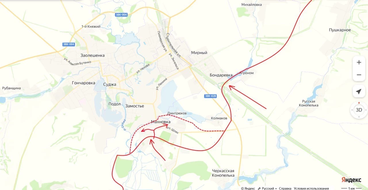Вместе с этим российские войска завершили занятие посёлка Махновка, который фактически входит в Суджанскую агломерацию - группу сёл вокруг Суджи, слившихся в единую жилую застройку. Освобождение этого посёлка особенно важен, так как агломерация имеет развитую дорожную инфраструктуру с асфальтированными дорогами. Это позволит российским войскам продолжить наступление даже в условиях распутицы, отмечает Подоляка в своём Telegram-канале.
