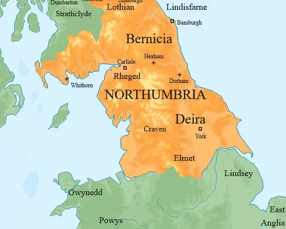 Королевство Нортумбрия на карте Британии. К северу от Дейры территория была известна как Берниция. Границы этих королевств были подвижными — контроль над землями Берниции и Дейры со временем переходил от одного королевства к другому, и со временем все эти земли стали признаваться как единое большое королевство, которое приняло древнеанглийское название Нортумбрия, означающее «народ или провинция к северу от реки Хамбер».