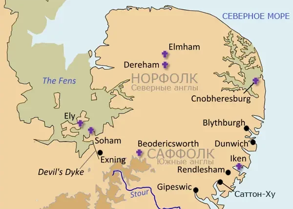 Карта королевства Восточная Англия. Показано расселение северных и южных англов. Крестиками обозначены монастыри.