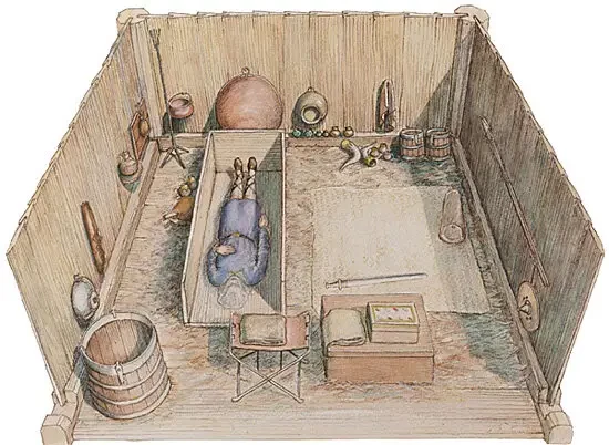 Реконструкция гробницы в Притлвелле. Более десятилетия кропотливых исследований позволили археологам детально реконструировать погребальную гробницу Приттлвелла. Кем именно был этот ранний христианский дворянин, останется загадкой. Из-за сильной кислотности почвы от скелета остались всего лишь несколько фрагментов зубной эмали. Стиль пряжек одежды и наличие оружия в гробнице указывают на мужчину, возможно, подростка. Судя по относительному расположению фрагментов зубов, золотым крестам из фольги, которые были надеты на его глаза, пряжке ремня на том, что могло быть его талией, и пряжкам подвязок там, где когда-то были его туфли, исследователи оценивают его рост примерно в пять футов восемь дюймов.