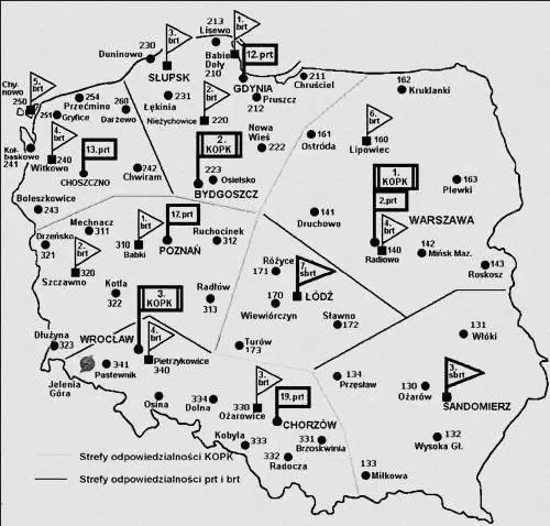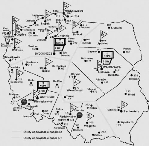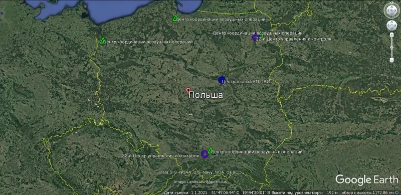 Схема размещения на территории Польши стационарных Командных пунктов ПВО и Центров координации воздушных операций