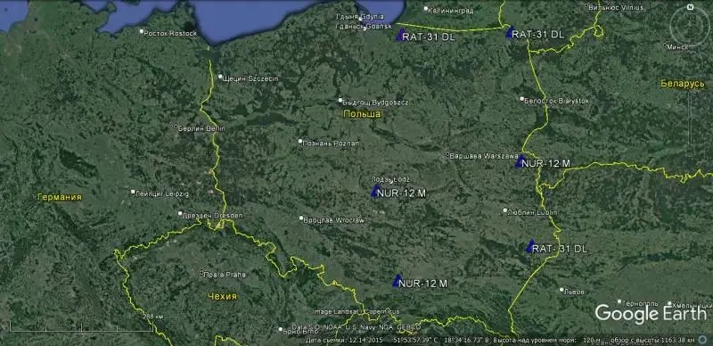 Схема расположения стационарных РЛС NUR-12М и RAT-31DL на территории Польши