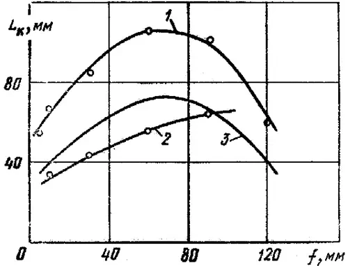 Зависимость конечной глубины проникания струи (Lк) от расстояния между зарядом и преградой (F). 1 — броневая сталь, 2 и 3 — ВНЖ на практике и по расчётам соответственно