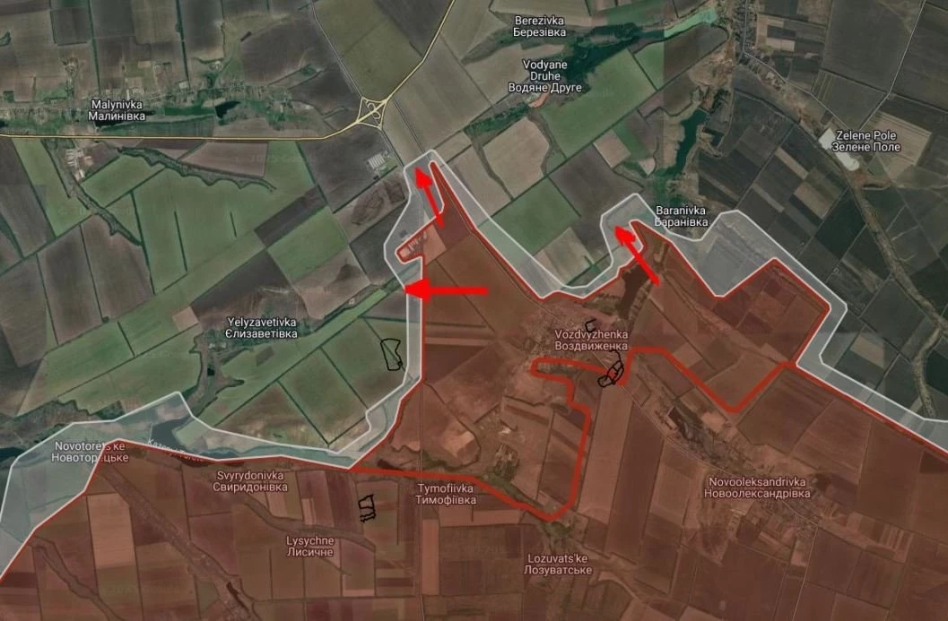 На Покровском направлении российские войска расширили контроль территории в районе Воздвиженки на запад, север и восток, давят в направлении Елизаветовки.