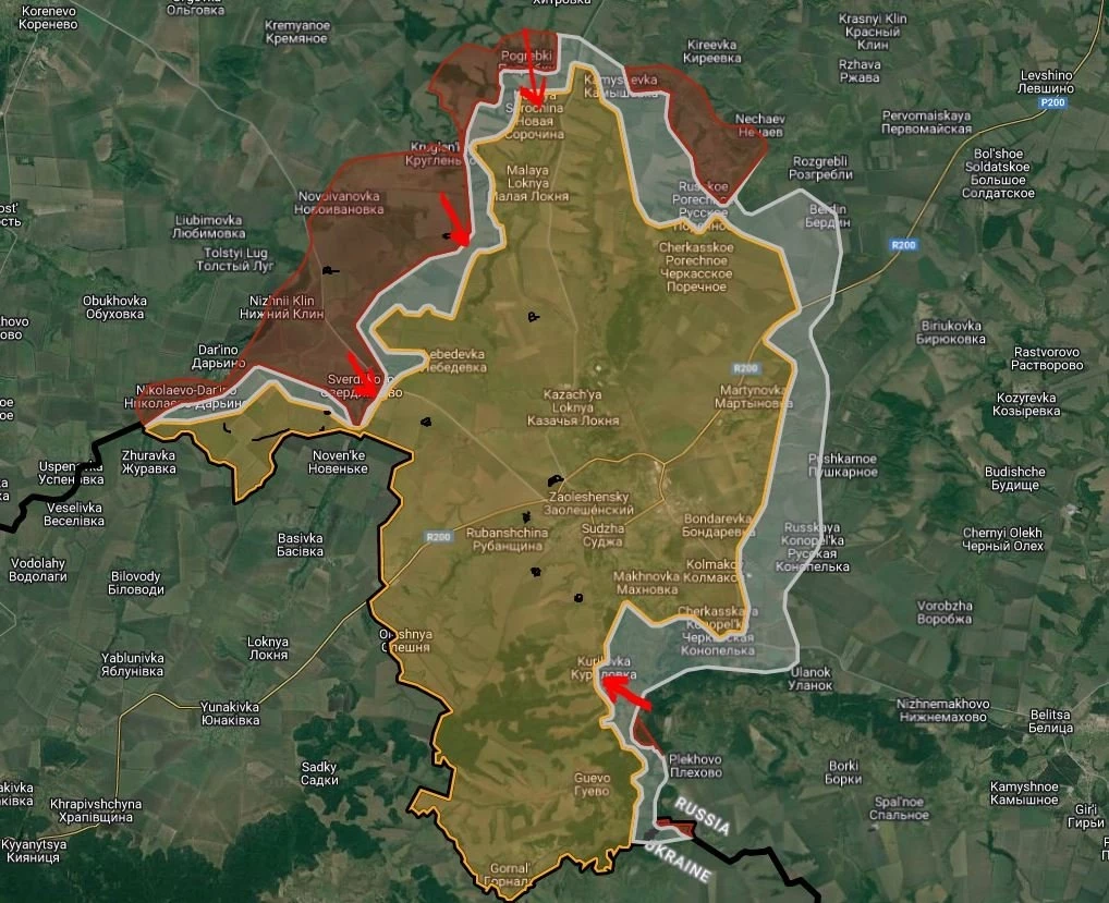Отмечается, что за последние пять дней российские военные зачистили пять населенных пунктов Курской области - Погребки, Орловка, Куриловка, Лебедевка и Черкасская Конопелька. Бои продолжаются в селе Малая Локня, деревнях Старая, Новая Сорочина, а также вблизи Гуево и Махновки.
