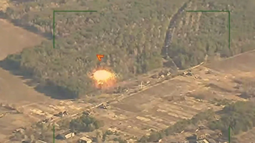 На видео видно, как украинские войска укрылись в лесном массиве. Впоследствии дрон зафиксировал мощный взрыв и яркое пламя, охватившее данную местность.