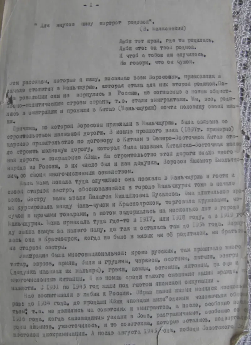 Автор данной статьи познакомился с Воросовой Анной Ивановной в 2010 г., когда, будучи студентом 5-го курса, готовил дипломную работу про русских эмигрантов, вернувшихся из Китая в СССР. Конечно, сами эмигранты уже давно к тому времени умерли, но молодому исследователю удалось пообщаться с несколькими людьми, которые родились в Китае в эмигрантских семьях и в 1950-х гг. приехали в СССР. Одной из них была женщина весьма преклонных лет – Анна Ивановна Воросова. Родилась она в городе Маньчжурия в 1924 г., а в 1954 г. вместе со своей семьей вернулась на историческую Родину. Первоначально семья Воросовых поселилась в Кемеровской области, но затем они переехали в Красноярский край, где Анна Ивановна долгие годы работала в школе учителем русского языка и литературы. Выйдя на пенсию, Анна Ивановна написала воспоминания о своей семье объёмом в 180 машинописных листов.