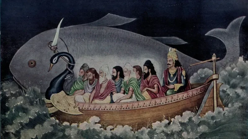 • В Индии: история о Ману, прародителе людей, которого бог Вишну в облике рыбы предупредил о грядущем потопе и велел построить корабль. Рыба буксировала корабль Ману, пока воды не спали, и он не пристал к горному хребту. Ману возродил жизнь, совершив жертвоприношение.