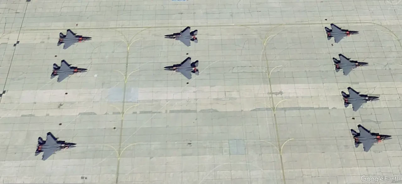 Спутниковый снимок Google Earth: истребитель F-15EX на заводском аэродроме Boeing в Сент-Луисе