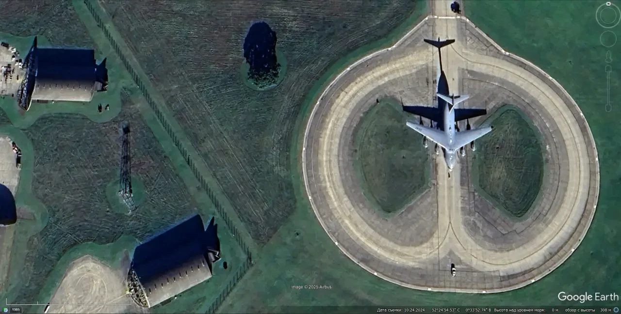 Спутниковый снимок Google Earth: военно-транспортный самолёт C-17А на авиабазе Лейкенхит