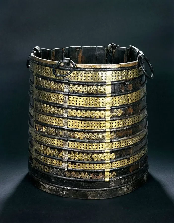 Интересно, что во время раскопок в Осеберге было найдено достаточно много предметов для кухни. Возможно, это были символы власти, потому что предметы эти явно не рядовые. То есть элита демонстрировала своё могущество, устраивая большие пиры и жертвоприношения. Археологи обнаружили два железных горшка разного размера, один с треногой. Железные горшки могли также быть особым символом статуса и власти. Среди найденной утвари были три венчика, которыми что-то взбивали, пять ковшей разного размера, два кухонных топора, железный нож и сито для процеживания молока. Посуда состояла из трёх небольших корыт, нескольких подносов и деревянной миски. Нашли и жернов для помола муки, состоящий из двух круглых камней с отверстием посередине, и с нетронутой деревянной рукояткой. Среди находок было несколько вёдер, включая и очень необычного вида «ведро Будды». Название это происходит от двух фигур, похожих на Будду, на его ручке. Вероятно, оно было привезено из Ирландии и может быть доказательством расширения викингами ареалов грабежа и торговли.