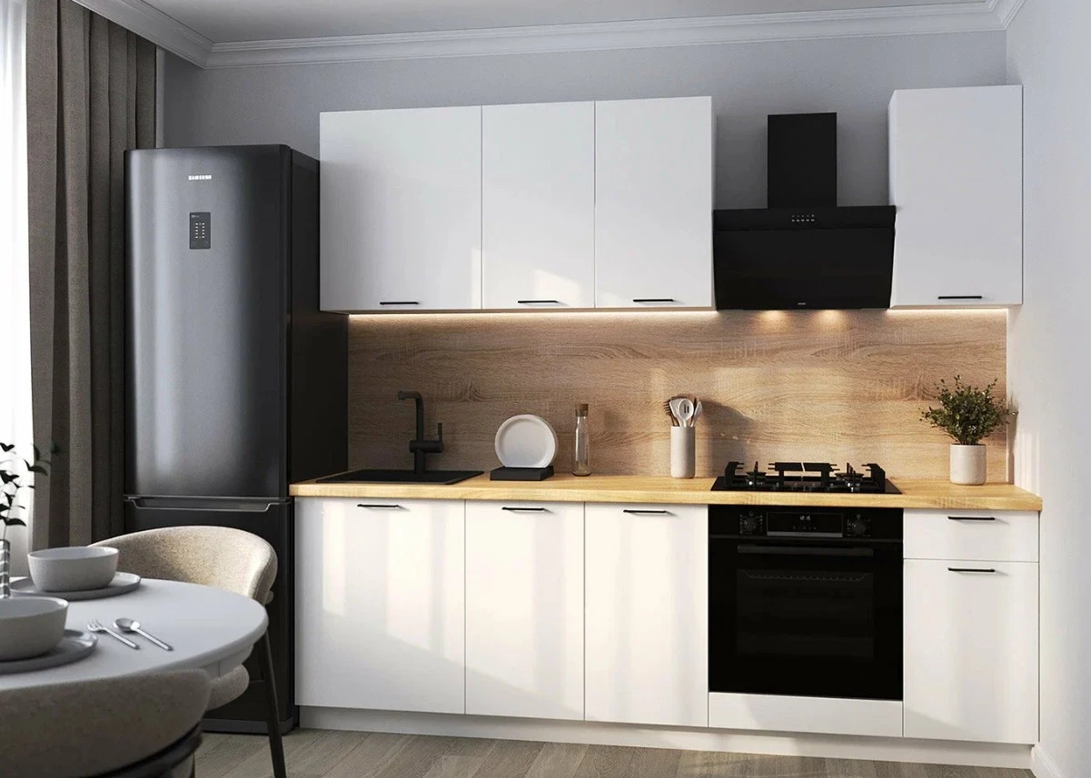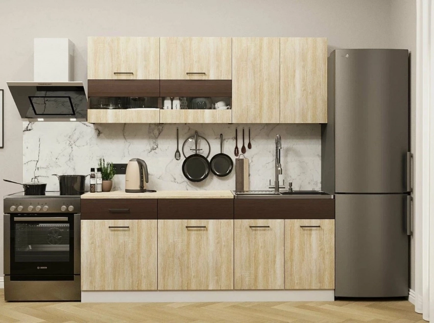 Кухонный гарнитур Ника — это лаконичное решение для небольших помещений, где каждый сантиметр на счету. Его компактность не мешает функциональности: при скромных габаритах он предлагает достаточно мест хранения и гибкость размещения модулей. Благодаря двум оттенкам — дуб сонома и белый — гарнитур впишется в любой интерьер в стиле минимализм. Для тех, кто задумывается, как выбрать мебель для кухни, Ника станет удачным примером сочетания доступной цены, современного дизайна и продуманной эргономики.