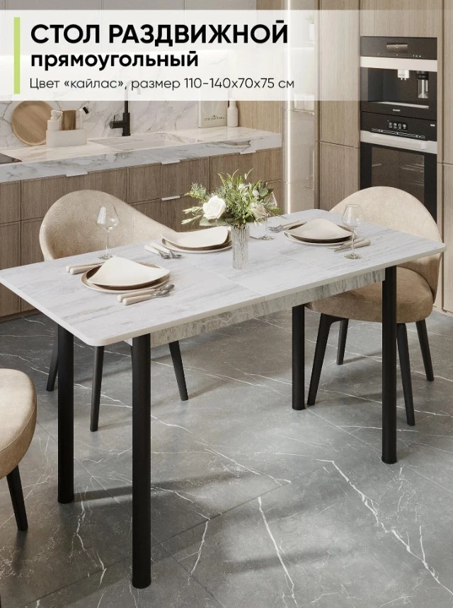 Раздвижной кухонный стол Алиса в цвете Кайлас — оптимальный вариант для тех, кто ценит практичность и стиль. Его компактные габариты (110×70×75 см) легко трансформируются до 140 см, что особенно важно в условиях ограниченного пространства. Надёжный раздвижной механизм и регулируемые по высоте хромированные опоры выделяют эту модель в рейтинге мебели для кухни, обеспечивая удобство и долговечность. ЛДСП с плотной кромкой ПВХ гарантирует износостойкость, а простая сборка с понятной инструкцией позволит быстро привести стол в рабочее состояние.
