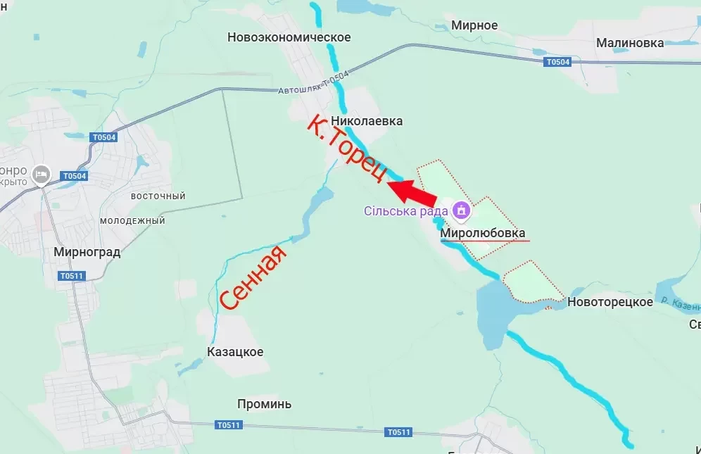 А выход западнее Казённого Торца создаёт усиливающееся давление на восточные окраины Мирнограда, лишая ВСУ возможности использовать реку в качестве естественной преграды. На пути у ВС РФ есть ещё река Сенная, но, во-первых, она является притоком Казённого Торца и потому существенно меньше него, во-вторых, у армии России есть позиции и южнее Сенной – со стороны ранее освобождённых Гродовки и Николаевки.
