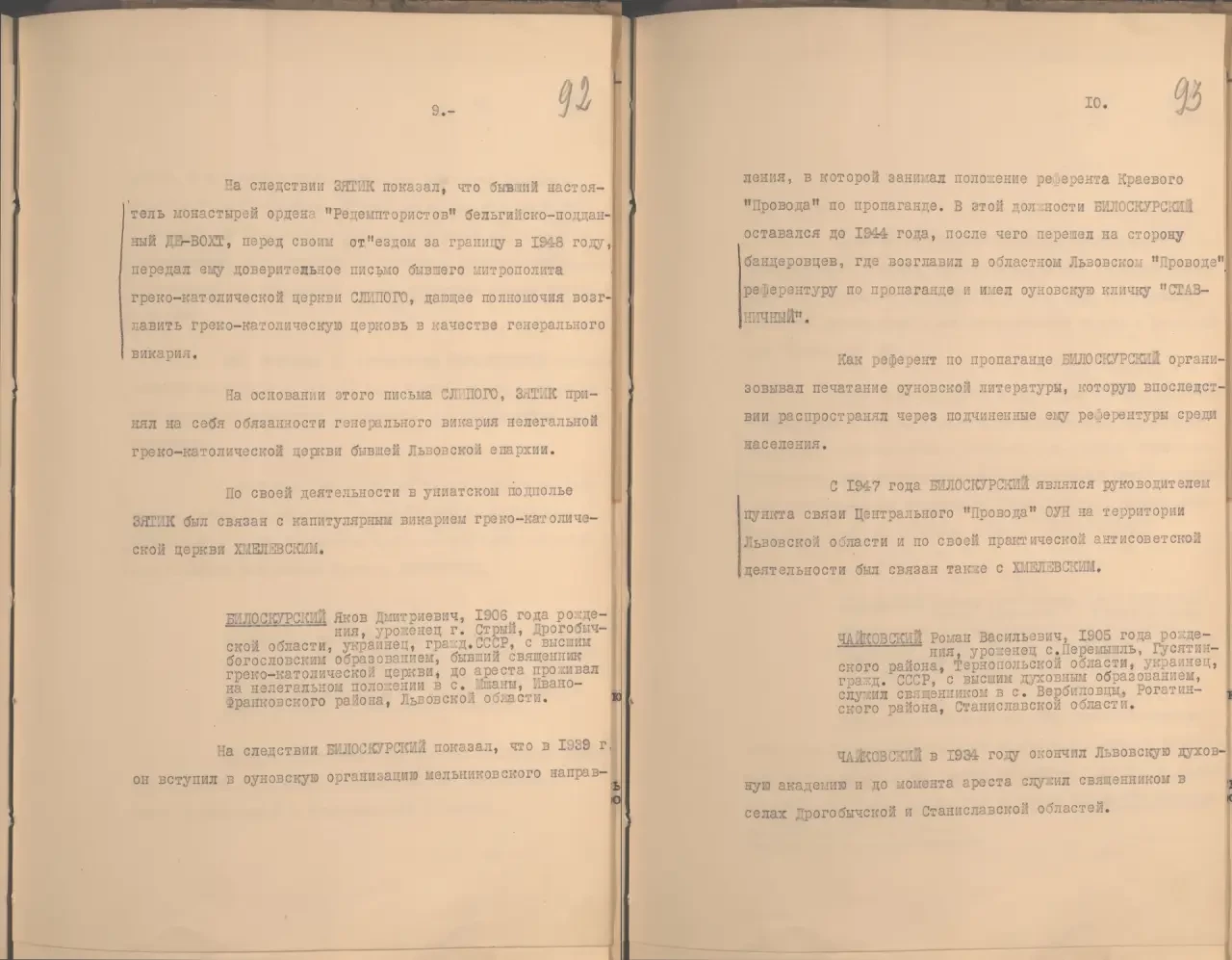 В частности, Иван Зятик, до ареста настоятель монастыря «Редемптористов» в Львовской области, выступал перед верующими с антисоветскими, нацистскими проповедями. Также в документах приводится информация и о других священниках греко-католической церкви, которые активно поддерживали ОУН-УПА: Я. Билоскурском, Р. Чайковском, М. Головацком и т. д.