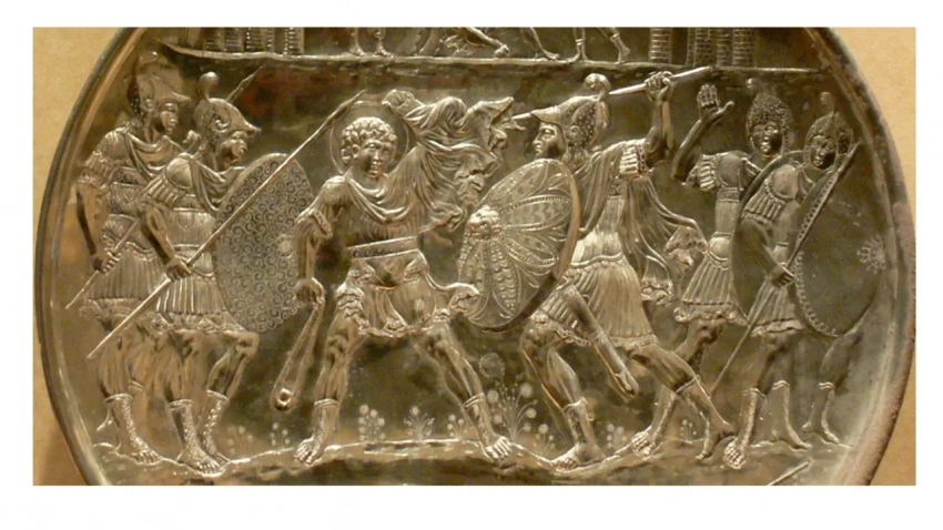 Ромейские воины. VII в. Серебряная тарелка, найденная в 1902 г. на Кипре. Музей Метрополитен. Нью-Йорк. Фото автора.