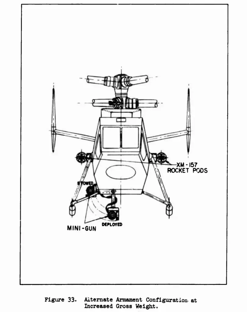 AARV также должен был быть оснащён собственным вооружением. Этот вопрос был решён путём установки 7,62-мм пулемёта «Миниган» на телескопической опоре под фюзеляжем, а блоки неуправляемых ракет могли быть размещены на пилонах по бокам фюзеляжа.