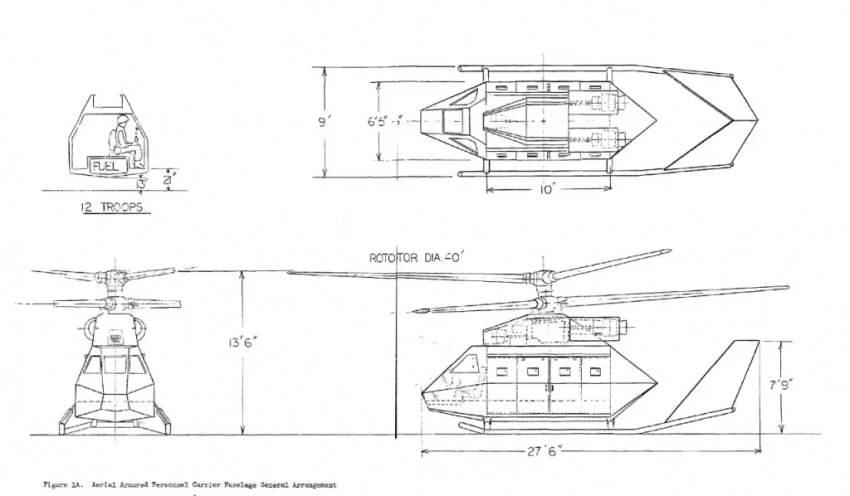 Чертеж фюзеляжа воздушного бронетранспортёра (AAPC) в трёх проекциях