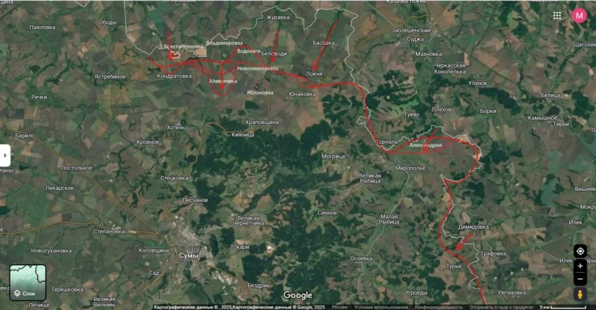 «Наше наступление на Сумы ускоряется. Противнику всё труднее сдерживать продвижение российских сил», - пояснил блогер.