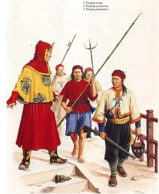 Постепенно в армии появилась форма одежды: солдаты носили куртку и штаны цвета своей армии (чёрный, синий, зелёный и так далее), на голове у каждого была обычная китайская коническая шляпа, плетённая из соломы. На куртках вышивались иероглифы, обозначавшие дивизию, полк и роту. Офицеры носили форму цвета своего ранга: младшие — красные куртку и штаны, средние — жёлтую куртку и красные штаны, старшие — жёлтые штаны и куртку. Тут сразу стоит отметить: жёлтый в Цинской империи запрещалось носить всем кроме императора, так что жёлтая форма была серьёзным вызовом — в плену за неё могли казнить (впрочем, тайпинским офицерам, в принципе, в плен попадать не рекомендовалось).