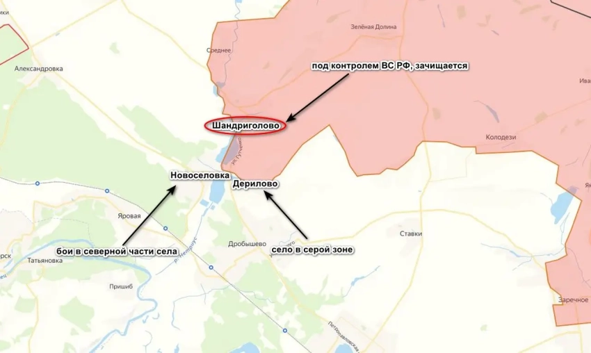 После потери противником контроля над Шандриголово, о чем сообщалось на днях, а также его полной зачистки, наши продолжили развивать наступление на Дерилово и Новоселовку. В селе Дерилово нашим удалось войти на восточные окраины и завязать бои за сам населенный пункт, хотя противник упирается здесь очень сильно. К вечеру появились данные, что штурмовые группы ВС РФ сумели войти и на северные окраины Новоселовки. О развитии ситуации пока сведений нет, но будем ждать новостей об установлении контроля и над этим селом.