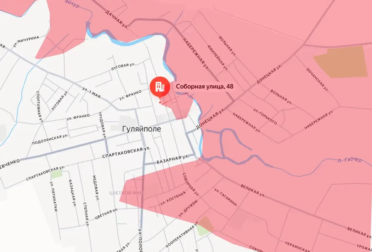 В Запорожской области российские войска добились нового успеха. Находит своё подтверждение информация о том, что наши бойцы форсировали реку Гайчур уже непосредственно в черте Гуляйполя и взяли под контроль улицы Соборная, Шевченко, Коровки и часть улицы Великая (Большая).