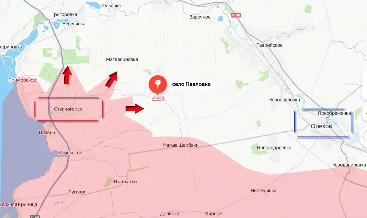 Продвижение российских штурмовых групп при поддержке артиллерии и дроноводов идёт в сторону села Павловка. А это способствует будущему охвату гарнизона ВСУ в Орехове, особенно если удастся перерезать ключевую автодорогу Р-08, соединяющую этот город с областным центром - Запорожьем.