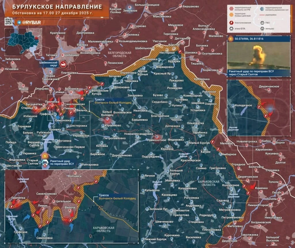 ВС РФ ведут бои в лесах между Прилипкой и Лиманом. Здесь наши продвинулись на 900 м, заняв 14 опорных пунктов ВСУ. Из шести из них противник просто сбежал. ВСУ безуспешно контратакуют на южных окраинах Вильчи. Штурмовые подразделения продолжают продвижение южнее Волчанска, а также на Хатненском участке фронта. при поддержке авиации ВКС РФ, артиллерии и ТОСов. Противник любой ценой пытается удержать занимаемые рубежи и контратакует.