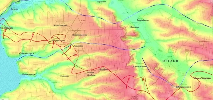 На южном участке фронта, в зоне ответственности группировки войск «Днепр», сохраняется высокая активность. По данным Юрия Подоляки, на Степногорском направлении российские подразделения развивают успех в районе Приморского. После освобождения Лукьяновского войска продвигаются на север, атакуя западные и южные окраины Павловки.