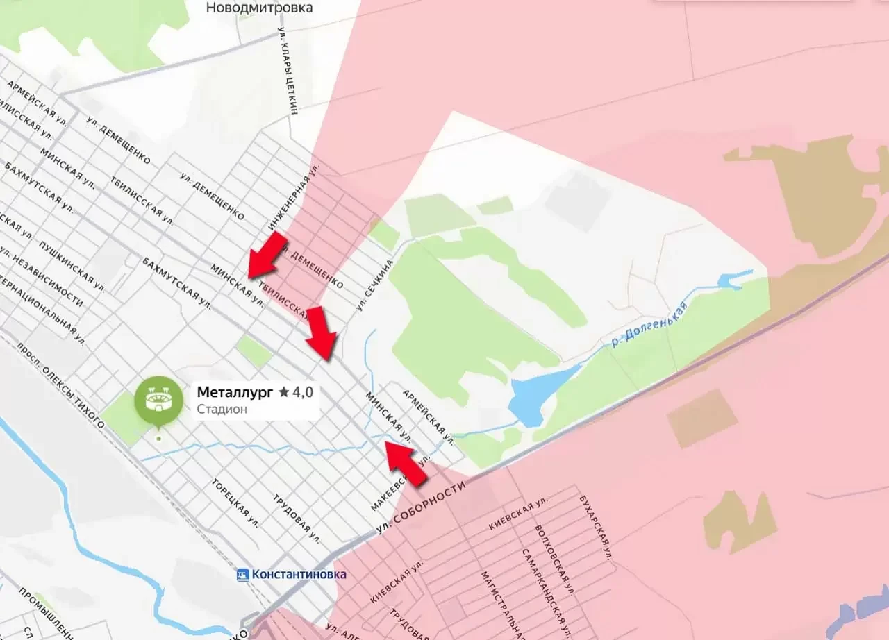 Одновременно с этим, несколько штурмовых групп при поддержке дроноводов прорвали оборону ВСУ в северо-восточной части Константиновки и вошли в город южнее села Новодмитровка. На этом участке ЛБС под контроль армии России перешли значительные части следующих улиц: Сталеплавильная, Мартеновская, Парковая, Белинского, Радищева, Волгоградская, Демещенко, Шанхайская, Армейская, Тбилисская, Инженерная.