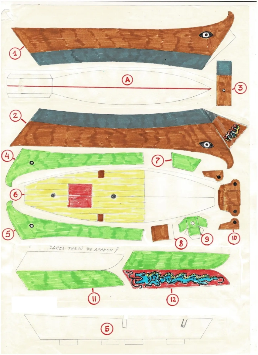 Развертки с деталями джонки: А – днище, Б – продольная переборка («ребро жесткости»), 1 – правый борт, 2 –левый борт вместе с носовой оконечностью, 3 – транец с отверстием для крепления руля, 4, 5 – левая и правая накладки на переднюю часть деталей 1 и 2, 6 – палуба, 7 – внутренняя накладка на нос, 8 – вал брашпиля (свернуть в трубочку), 9 – степс (гнездо) бизань мачты, 10 – детали брашпиля, 11, 12 – расписные борта кормовой палубы (перегибаются пополам!), 13 – кормовая палуба, 14 – внешняя часть кормовой палубы, 15 – тент из бумаги, 16 – детали лестницы на кормовую палубу, 17 – опора уложенной мачты (перегибается пополам!), 18 – флаг (лучше вырезать из ткани и покрасить акриловой краской), 19 – лопасть руля (перегибается пополам, 20, 21, 22 – паруса с расположенными на них реями, 23 – крепления реев к мачтам (из бумаги). Рисунок автора