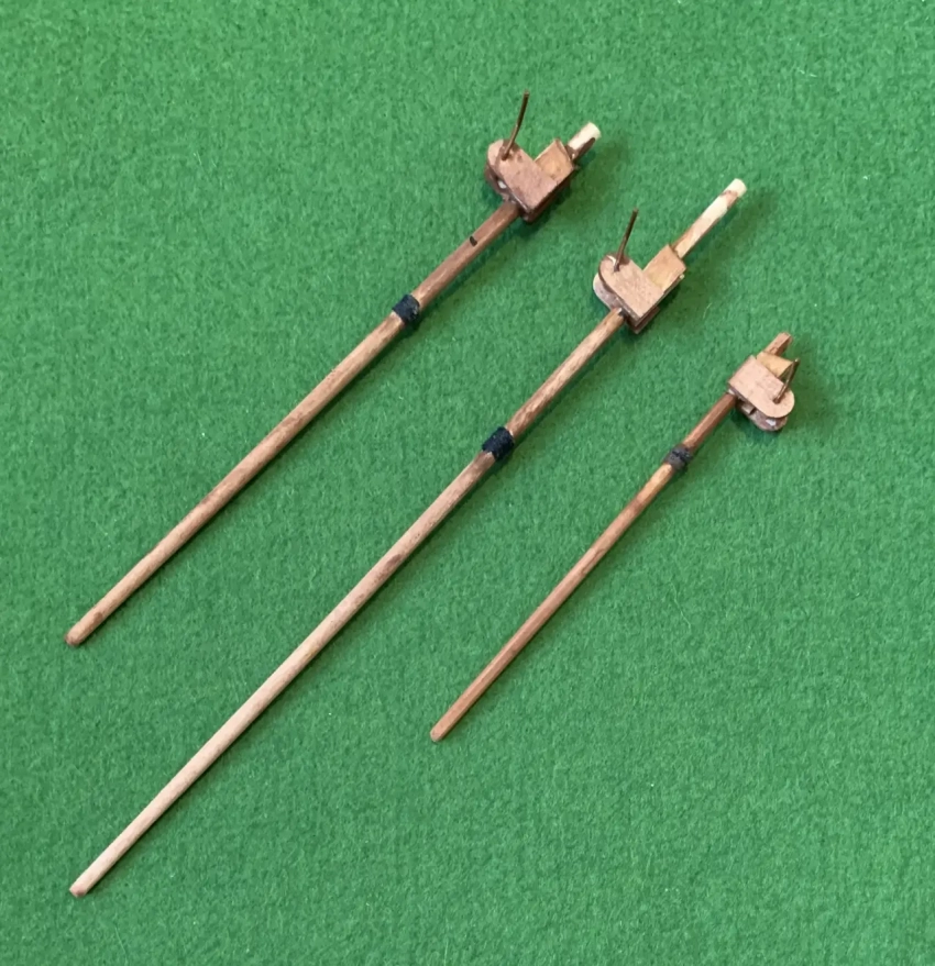 На нашей модели эти «латы» выполнены из реек шириной 2 мм фирмы «АВ-модель», но можно точно так же вырезать их из бумаги. На мачту парус «надевается» с помощью таких же полосок (или реек), которые выгибаются и приклеиваются к латам так, чтобы под них можно было бы просунуть мачту. Длина таких полосок из реек должна быть не меньше 30 мм, иначе они будут ломаться, а вот если они бумажные, то размеров деталей 23 для того, чтобы закрепить паруса на мачтах, будет вполне достаточно.