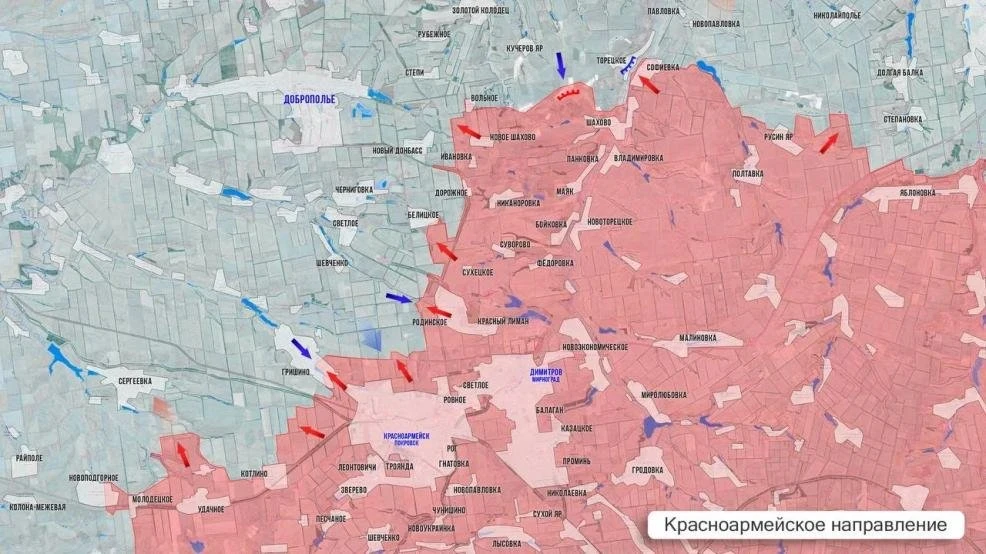 На Краснолиманском фронте ВС РФ закрепились на юго-востоке Красного Лимана и продвигаются на северо-запад, чтобы установить контроль над дорогой на Славянск. Улучшили позиции в лесах на севере и востоке Дробышево. Выше по фронту наши штурмуют Святогорск, дожимают противника в Александровке, наступаю на Коровий Яр.