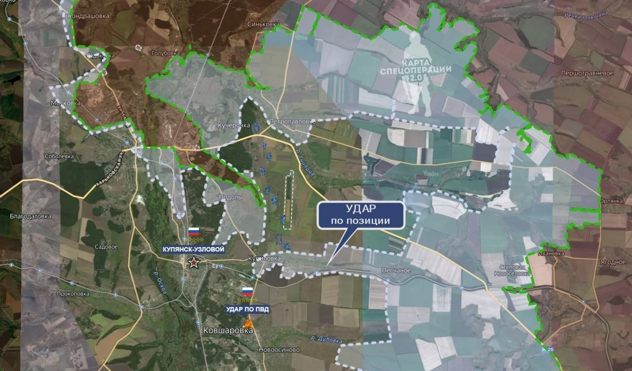Начальник Генштаба ВС РФ Герасимов заявил об освобождении Купянска-Узлового. Однако, как отмечают военные аналитики, визуальных подтверждений пока нет. Зато есть кадры ударов по врагу в западной части Куриловки и в первом микрорайоне Ковшаровки. В районе Подол остаётся серая зона из-за активности обеих сторон.