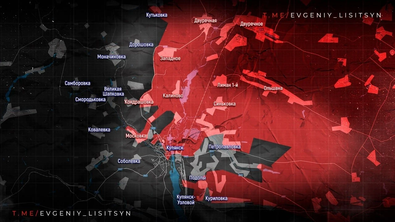 На Купянском направлении под контроль армии России перешел участок в 20 км² в районе Петропавловки, подтвержден заход в северную часть Купянск-Узлового, уточнил в своём Telegram-канале военкор Евгений Лисицын.