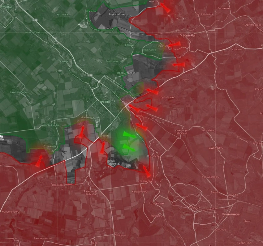 На Константиновском фронте ВС РФ зачищают подвалы на северо-восточной окраине занятого вчера Берестка, от которого до южного предполья Константиновки остаётся 1 км. Наши накапливаются в районе соседней Ильиновки, чтобы продолжать штурм села. В Константиновке под контролем российских войск ж/д вокзал и его территория. На северном фланге без существенных изменений: идут бои на рубеже Марково - Майское.