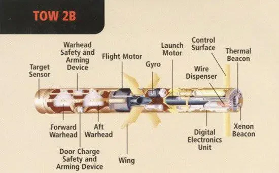 На ракете BGM-71E (TOW-2А), запущенной в серийное производство в 1987 году, в носовой части расположена миниатюрная тандемная БЧ диаметром 38 мм и массой около 300 г, предназначенная для преодоления динамической защиты. Контактный механический взрыватель, находящийся на головной части наконечника, инициирует первую вспомогательную БЧ, детонация основного заряда происходит после подрыва и разрушения реактивной брони вспомогательным зарядом. Подрыв основной кумулятивной БЧ массой 5,896 кг осуществляется на расстоянии около 450 мм от преграды.