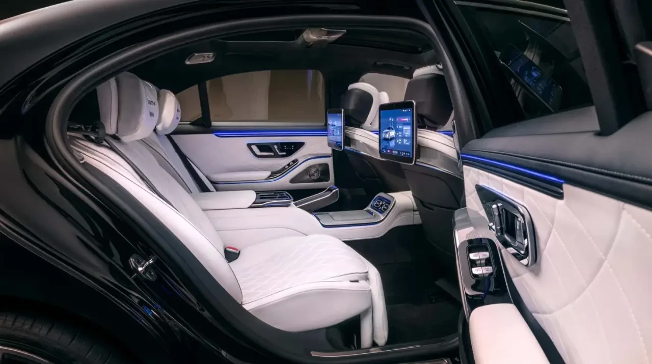 Для задних пассажиров предусмотрены съёмные пульты (два) MBUX, позволяющие управлять функциями автомобиля — климат-контролем, солнцезащитными шторками. Размер дисплеев, которые размещены за передними сиденьями, увеличен до 33,3 см. Экраны оснащены встроенными HD-камерами и подходят для деловых видеоконференций через Microsoft Teams, Zoom и Webex.