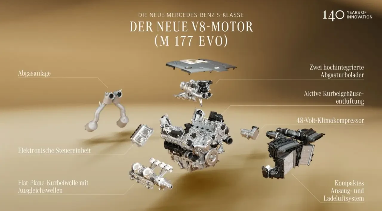 Силовая архитектура нового S-класса основана на двигателях, в которых передовые технологии сочетаются с образцовой плавностью работы. Флагманскую позицию занимает V8 M 177 Evo, устанавливаемый на S 580 4MATIC с удлинённой колёсной базой. Развивая 395 кВт (537 л. с.) и 750 Н·м крутящего момента в широком диапазоне оборотов, он обеспечивает уверенную динамику при неизменно высоком уровне комфорта.