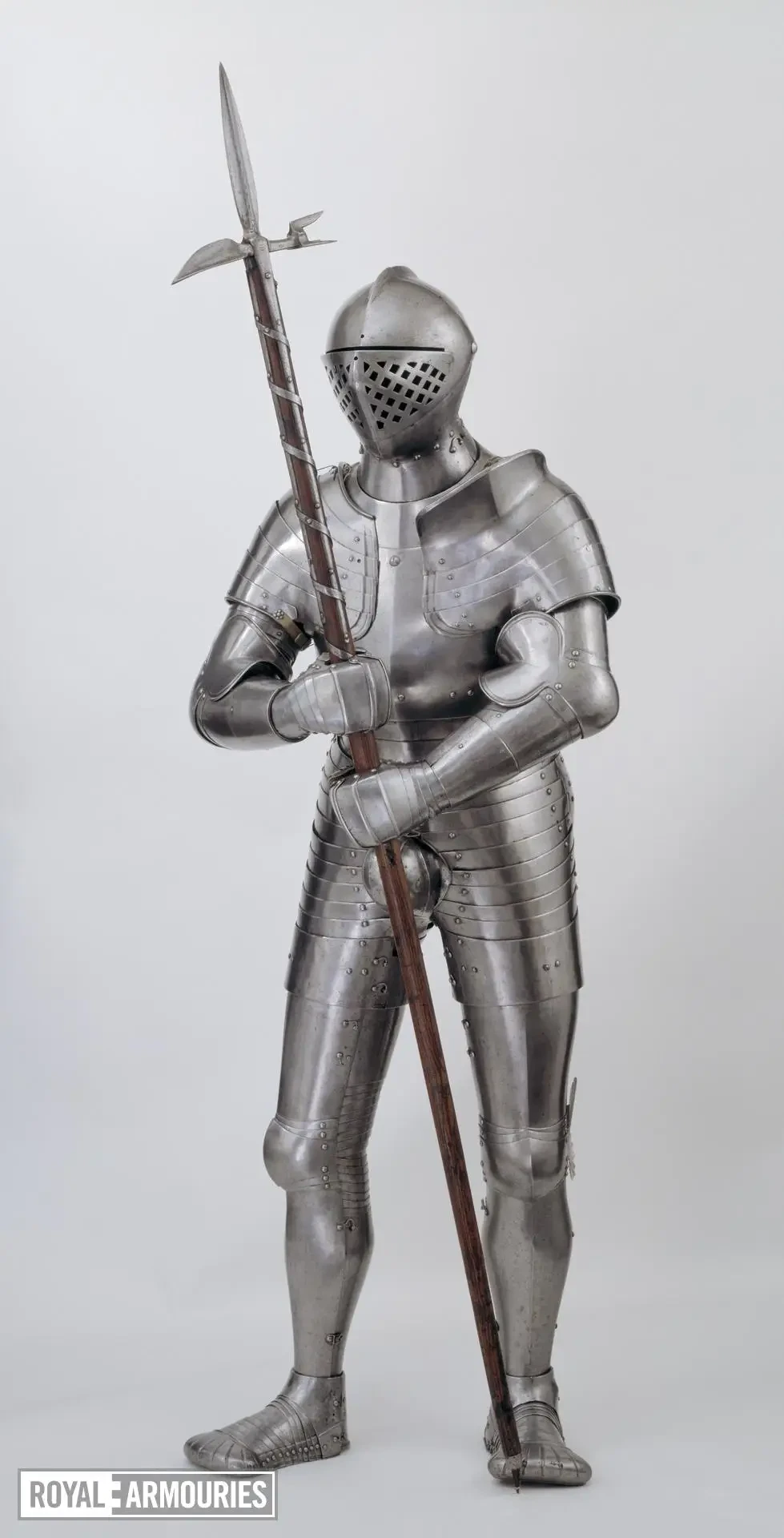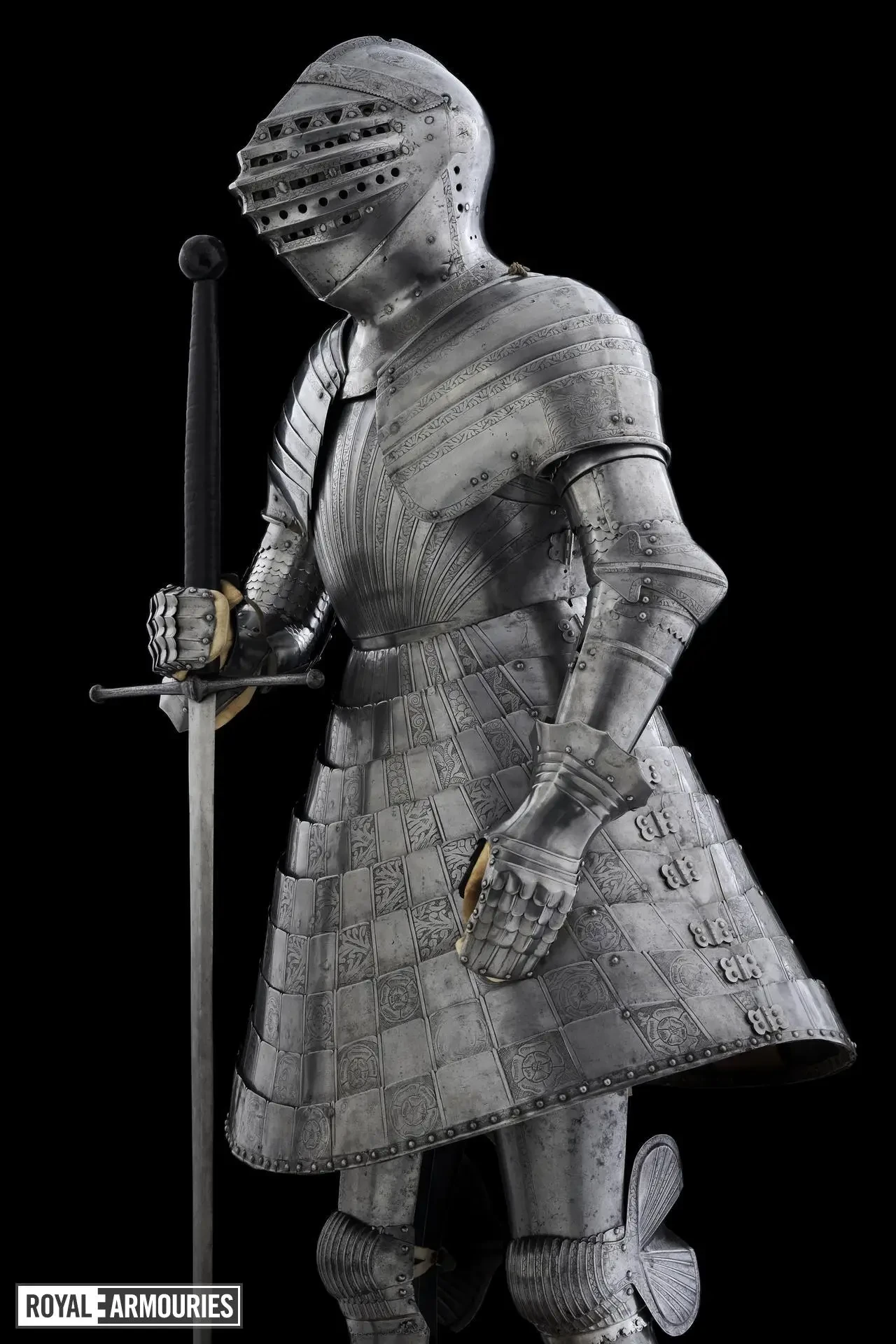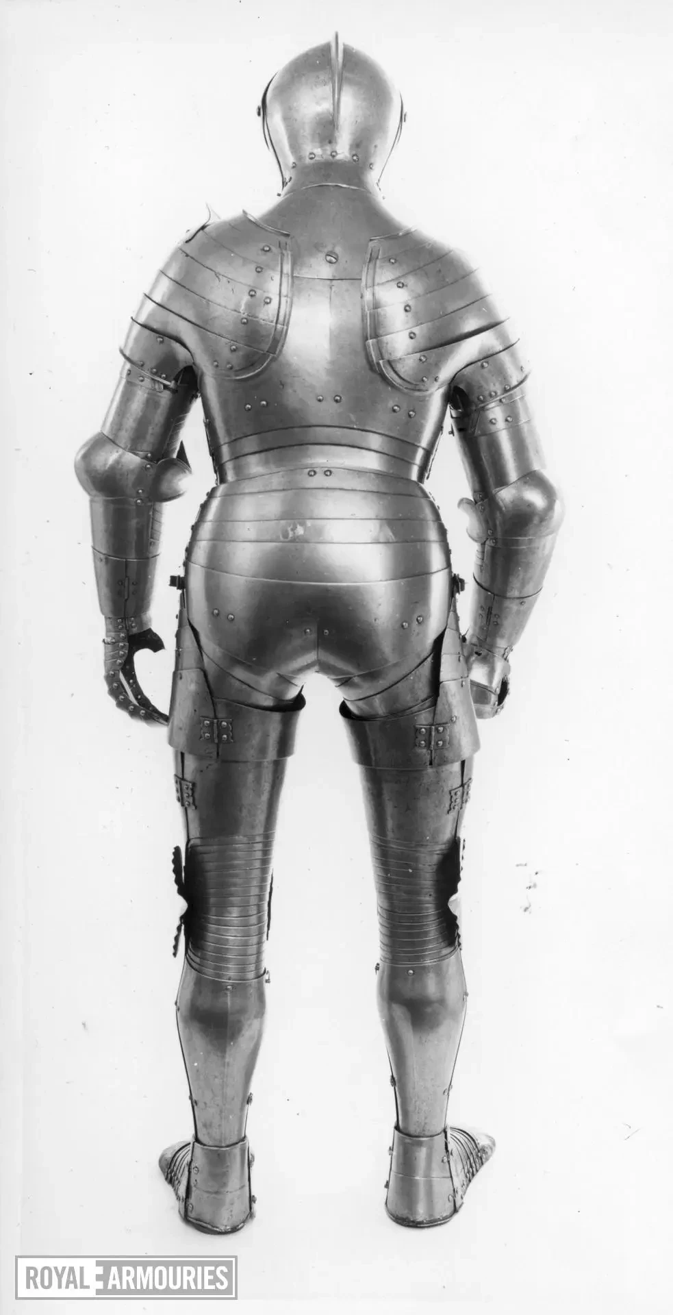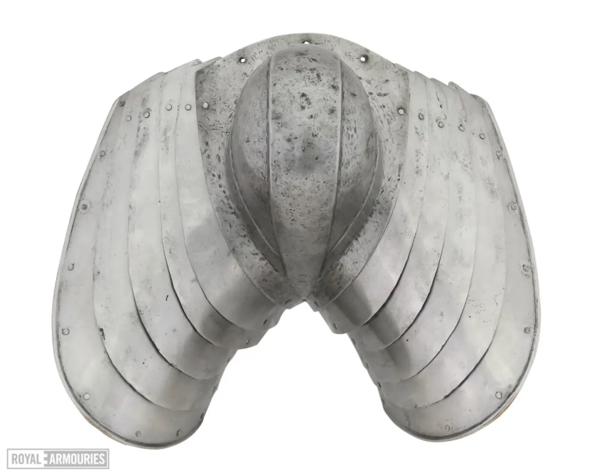 Наплечники из перекрывающих друг друга пластин стали отличительной особенностью мастерской в Гринвиче. Левый (если смотреть спереди) наплечник состоял из восьми полос, а вот правый почему-то из семи. Юбка состоит из девяти полос, как спереди, так и сзади. Петли на ней находятся слева, пряжки ремней справа. Латы для ног могли быть изготовлены в Италии или во Фландрии. Их попросту взяли от какого-то старого доспеха.