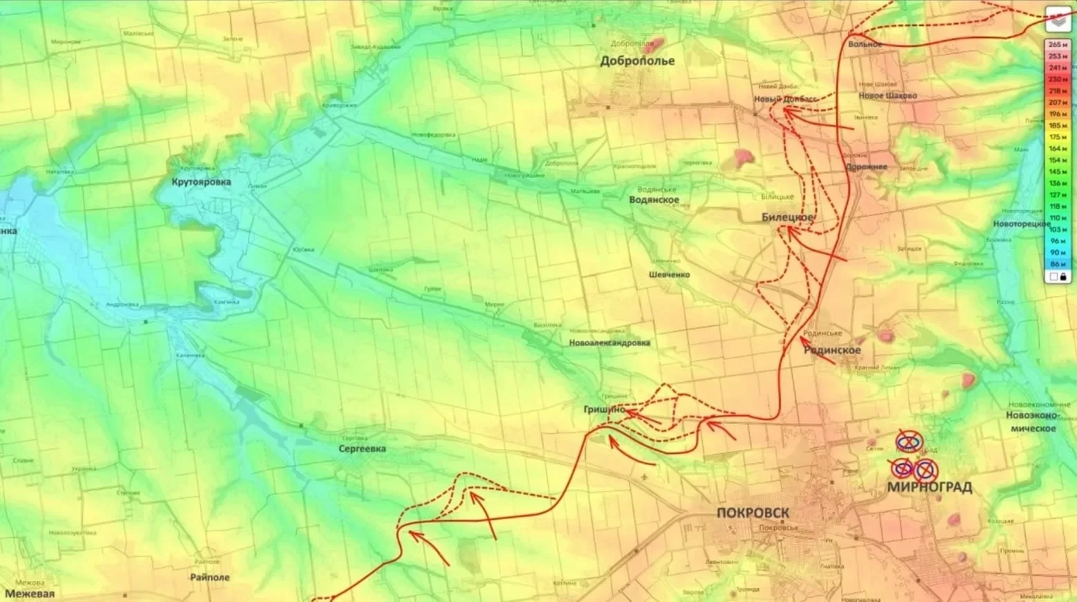 Отдельное внимание в сводке уделяется району Красноармейска. По словам Подоляки, российские подразделения заняли около половины села Гришино, ещё порядка 30% территории остаётся в «серой зоне». Идёт продвижение к северо-востоку от населённого пункта в направлении Новоалександровки.