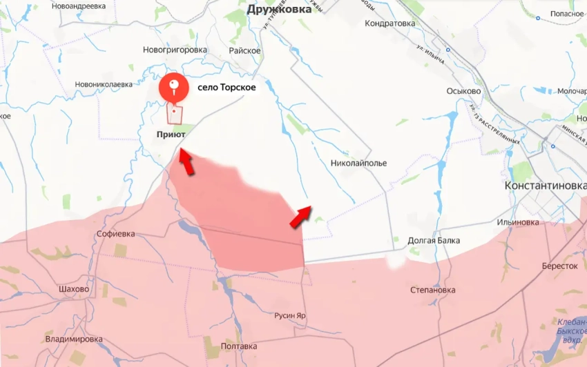 Российские войска перевели под свой контроль левый берег реки Полтавка к северу от одноимённого, ранее освобождённого, села и Русинова Яра и вышли в район сёл Торское (не путать с одноимённым селом на северо-востоке Донбасса) и Приют.