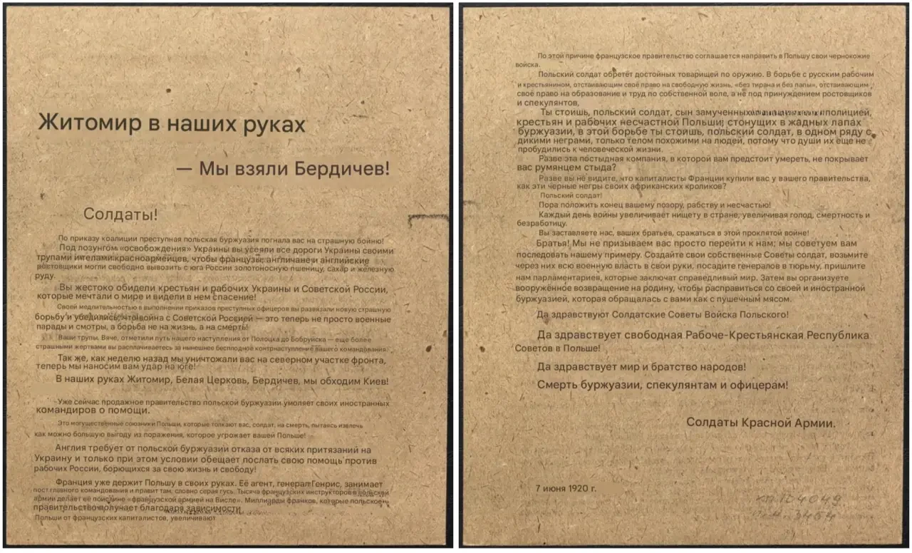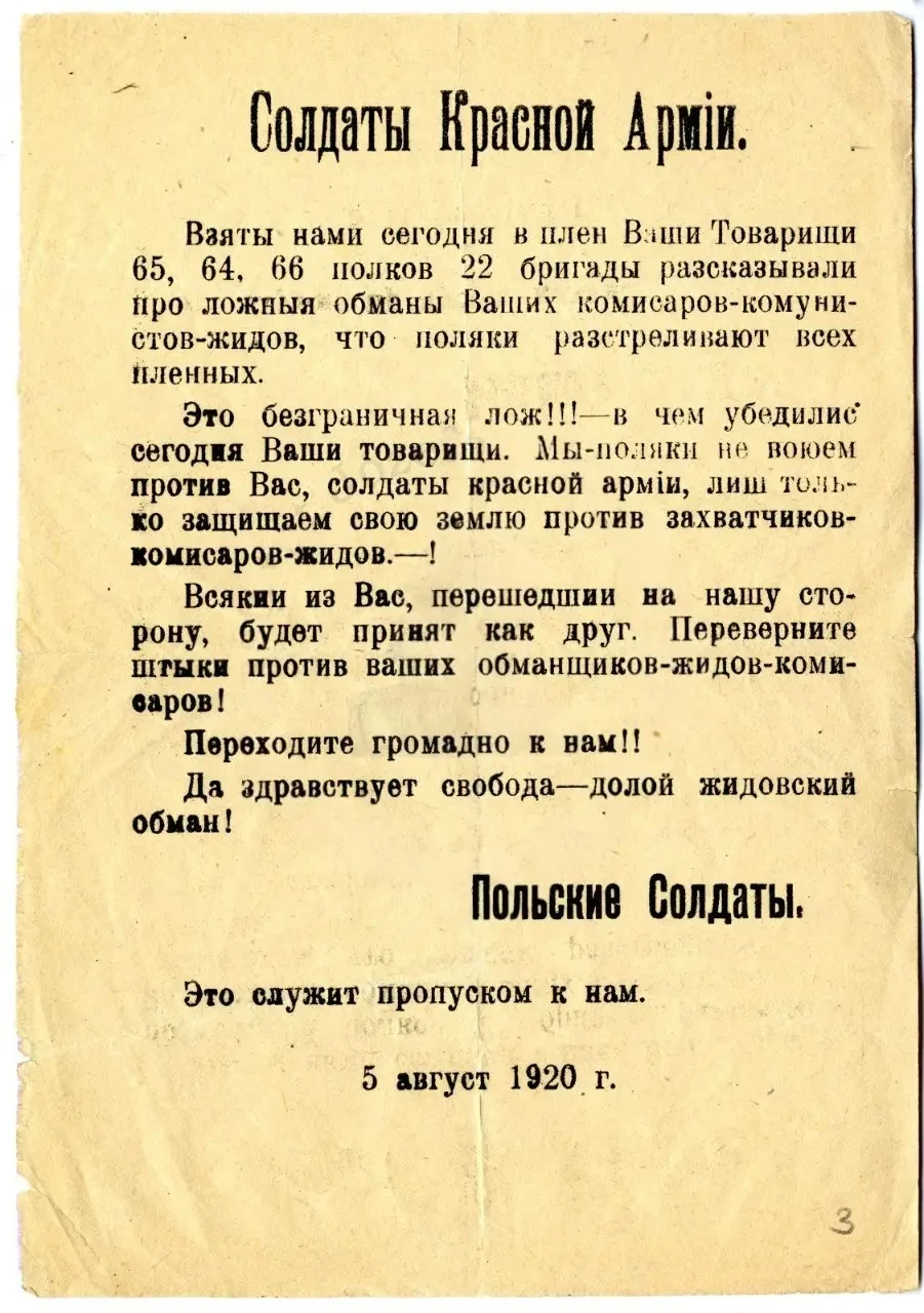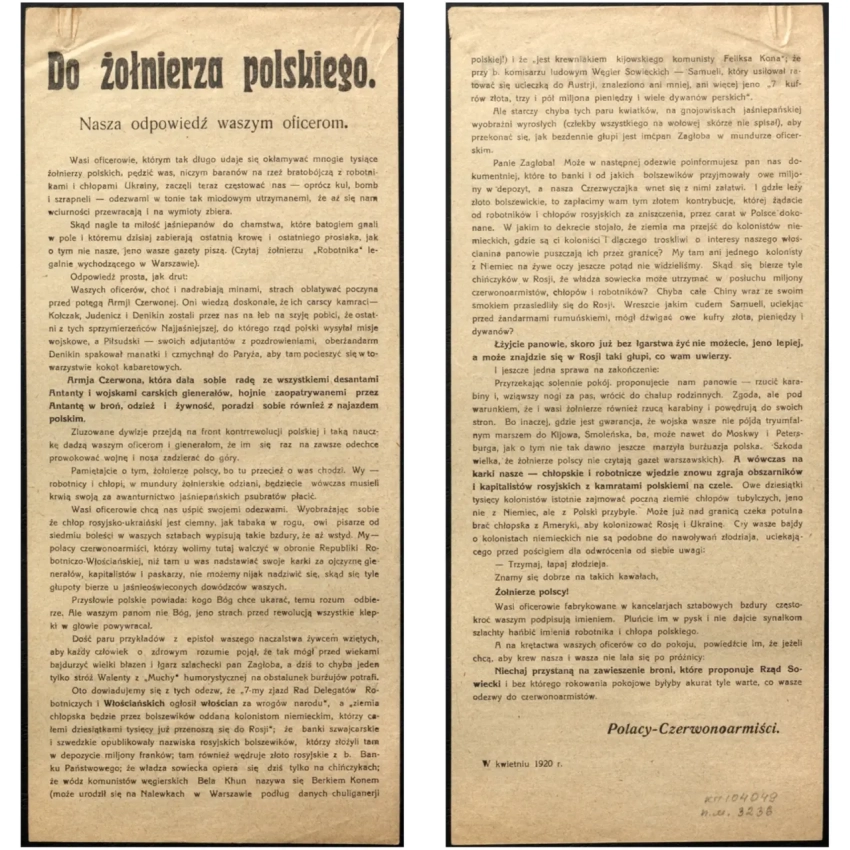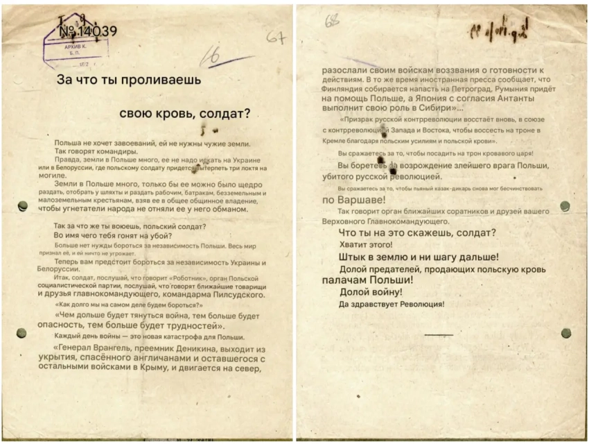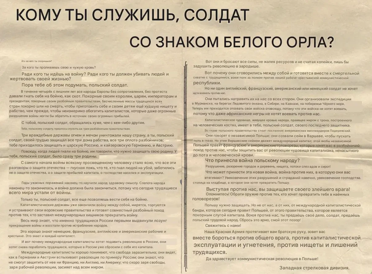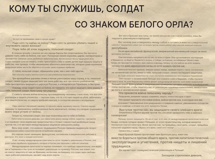 Листовка политотдела РВС Западного фронта с обращением к польским солдатам, воюющим против Красной Армии, не поддаваться антисоветской пропаганде и переходить на сторону красных. Архив РГАСПИ: КП-104049 ПМ-3230.