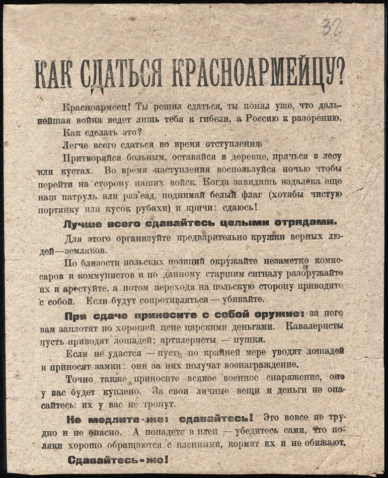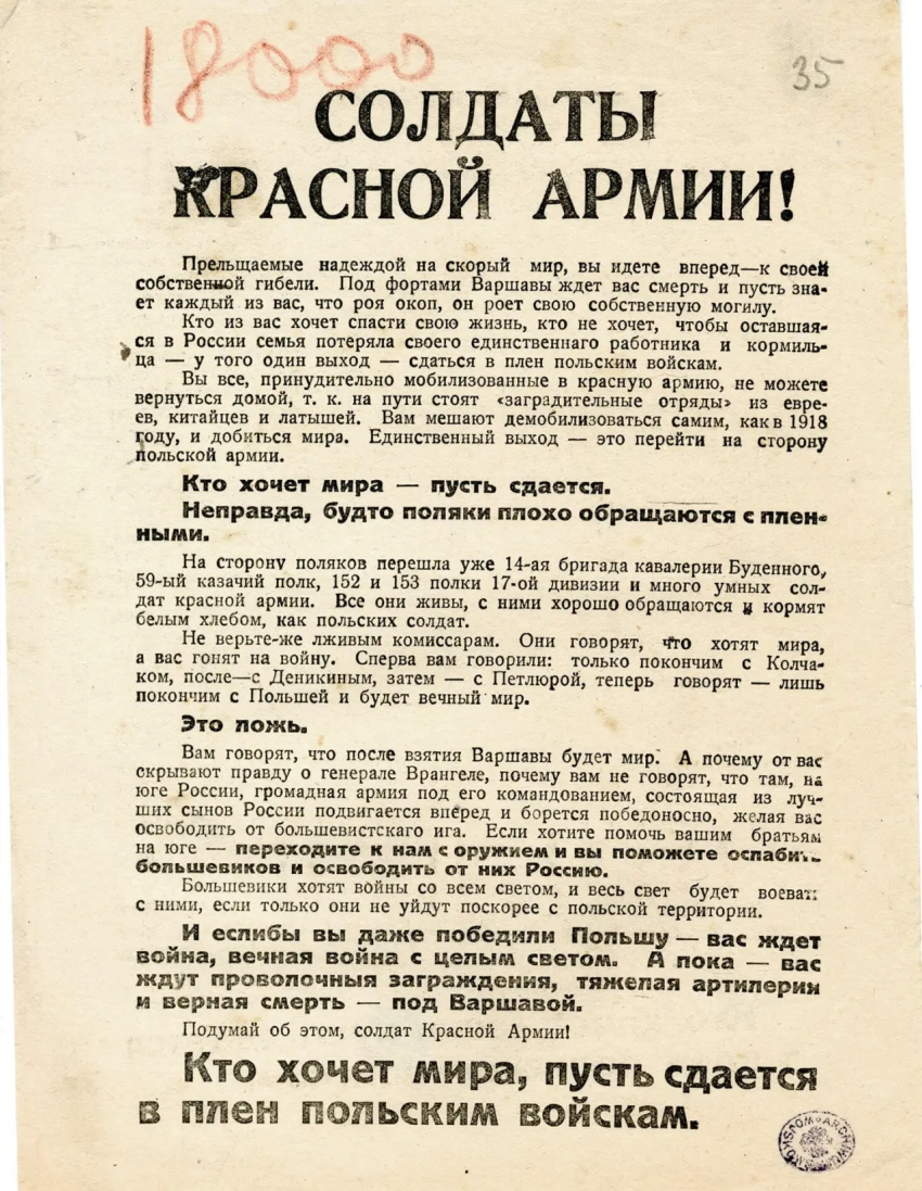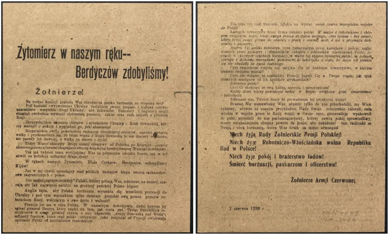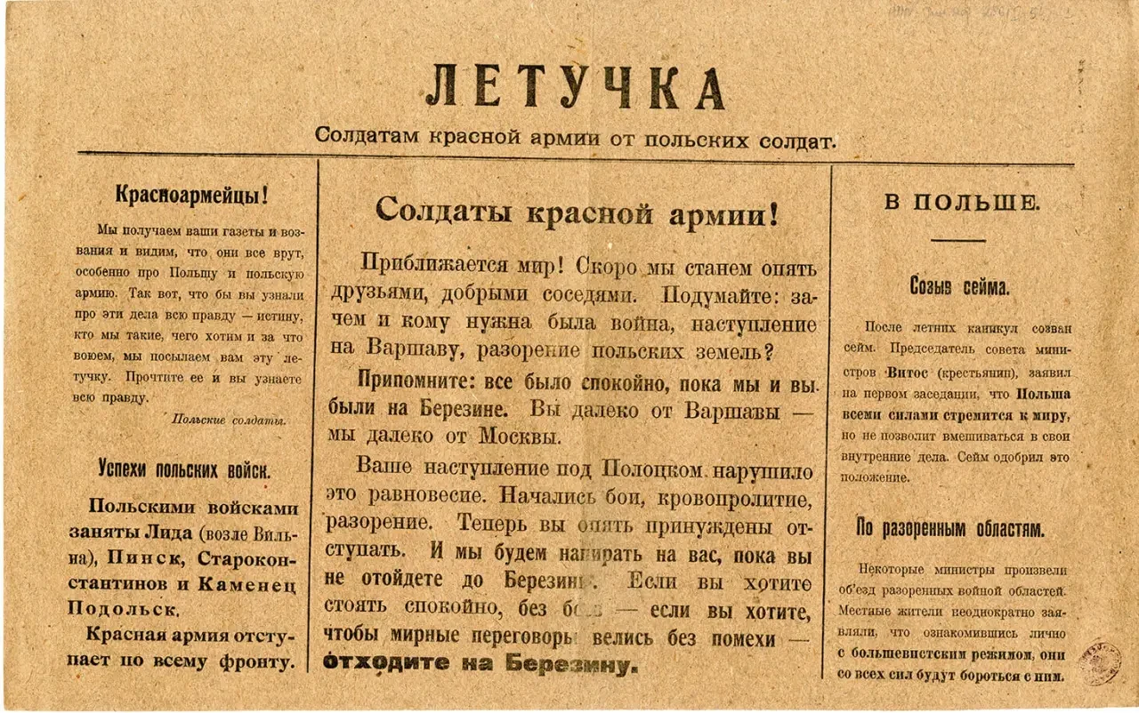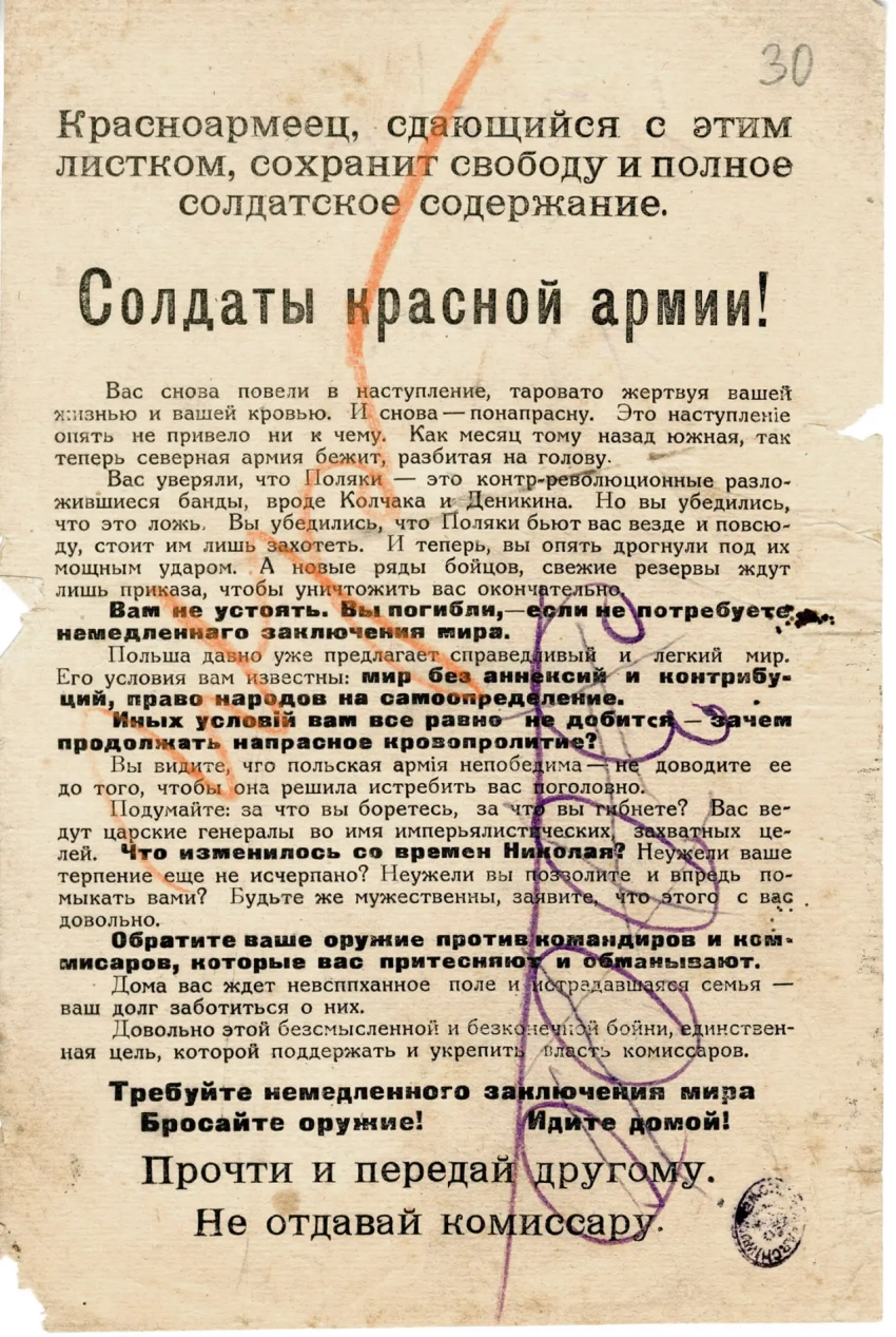Листовка политотдела РВС Западного фронта с обращением к польским солдатам, воюющим против Красной Армии, не поддаваться антисоветской пропаганде и переходить на сторону красных. Архив РГАСПИ: КП-104049 ПМ-3230.