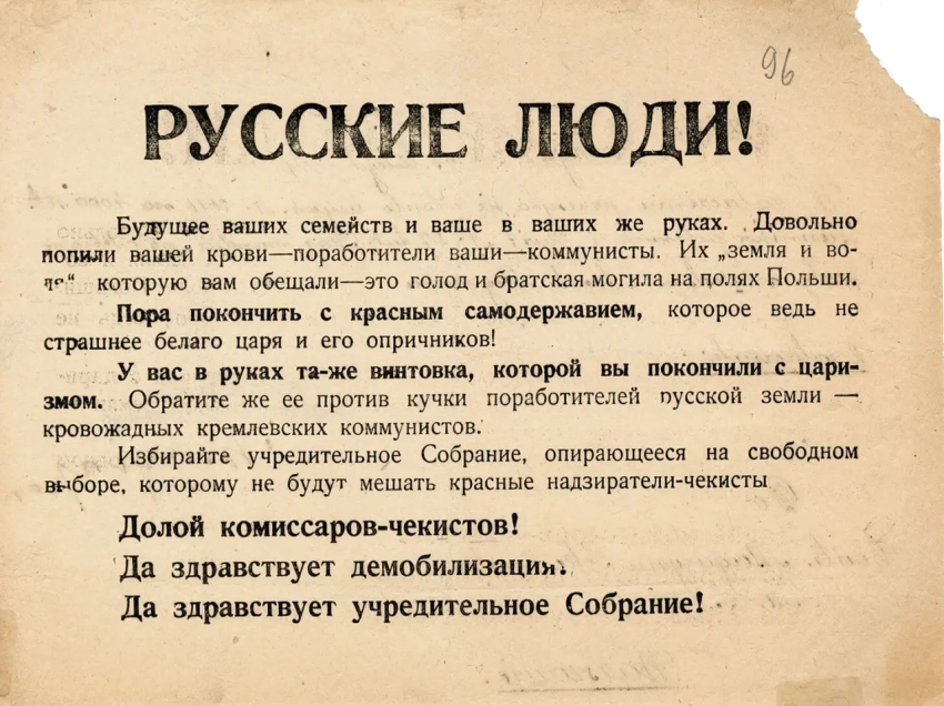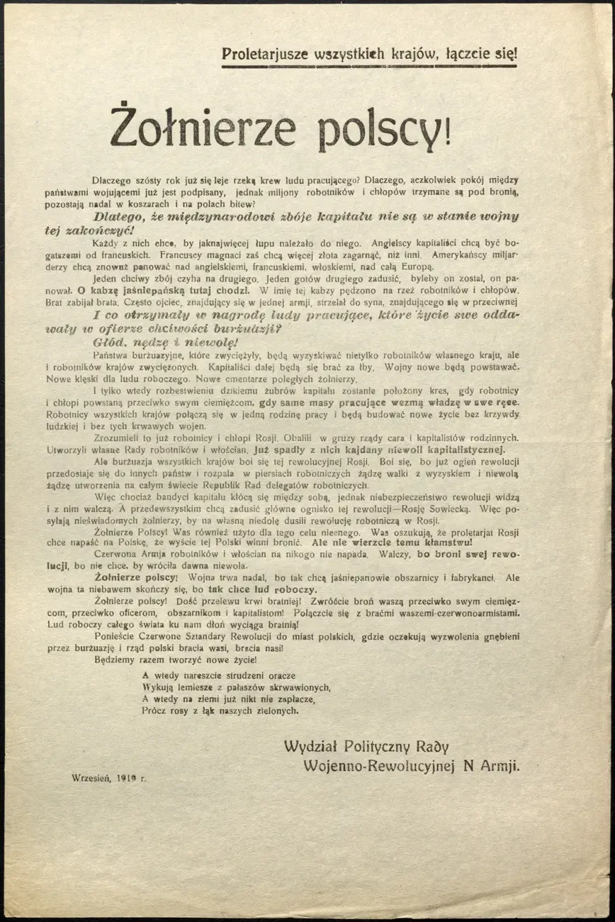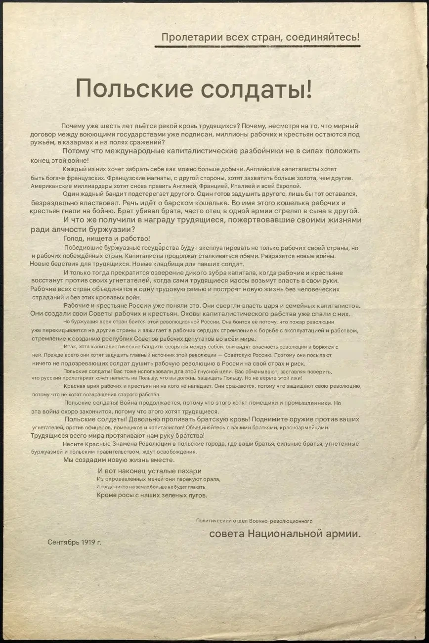 Листовка политотдела РВС N-ской армии с обращением к польским солдатам не принимать участия в войне, выгодной лишь капиталистам и панам. Архив РГАСПИ: КП-104049 ПМ-3429.