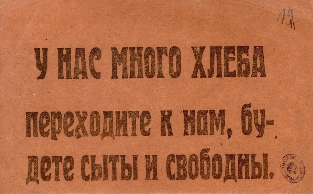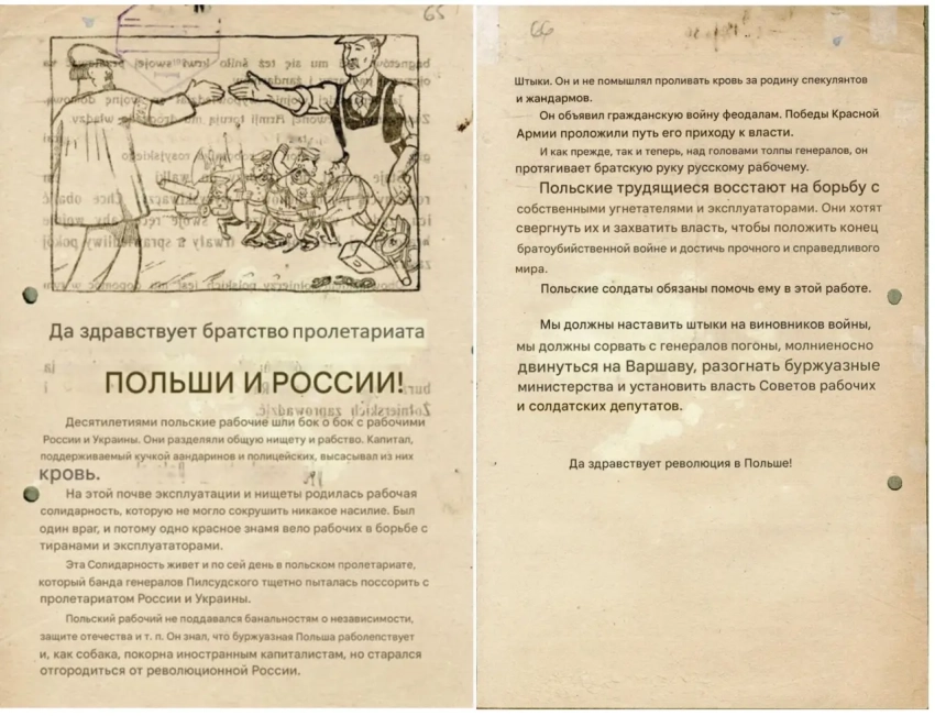 Листовка-пропуск с обращением к польским солдатам. Данный вид агитации использовался советскими войсками уже в 1919 году. Архив РГАСПИ: Ф. 104. Оп. 1. Д. 18. Л. 22–22.