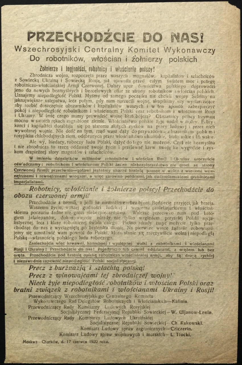 Листовка c обращением ВЦИК к польским рабочим, крестьянам и солдатам «Переходите к нам!». Архив РГАСПИ: КП-104049 ПМ-3375.