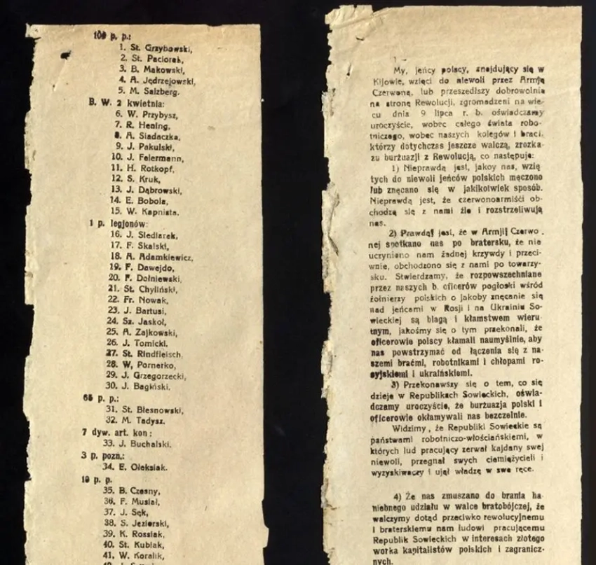 Фрагмент длинной листовки. С лицевой стороны написан текст от имени польских солдат, попавших в плен Красной Армии, о том, что с ними здесь хорошо обращаются. На обратной стороне листовки приведён длинный список имён пленных поляков с указанием военных частей, в которых они служили. От лица этих пленных и написана листовка. Фото из польского архива.
